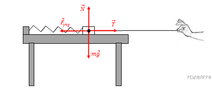 Версия для печати и копирования в MS WordНеподвижный груз, расположенный на столе с бортиком, закреплен к столу с помощью пружины и тянется с помощью нити как показано на рисунке. Нарисуйте все силы, действующие на брус. Трением пренебречь.