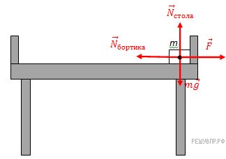 Версия для печати и копирования в MS WordНа столе с бортиком неподвижно лежит груз, который упирается в бортик стола. К грузу приложена сила, направленная в сторону бортика, в который он упирается. Нарисуйте все силы, действующие на груз. Трением пренебречь.
