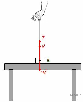 Спрятать критерииГруз, лежащий на столе неподвижно, испытывает действие силы нити, силы реакции опоры и силы тяжести. Направление сил показано на рисунке. В момент отрыва груза от поверхности он перестает давить на стол, а значит, у нас пропадет сила реакции опоры.
