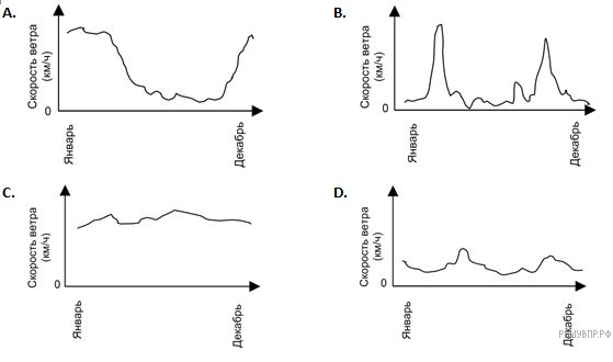 На графиках, представленных ниже, показано среднее значение скорости ветра в четырёх различных местах на протяжении года. Какой из графиков соответствует наиболее подходящему месту для сооружения генератора, производящего энергию за счёт ветра?