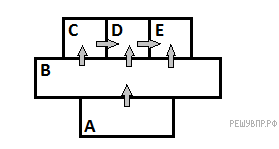 Пять металлических брусков (А, B, C, D, E) положили вплотную друг к другу, как показано на рисунке. Стрелки указывают направление теплопередачи от бруска к бруску. Температуры брусков в данный момент составляют 90 °C, 80 °C, 60 °C, 50 °C, 30 °C. Какой из брусков имеет температуру 60 °C?