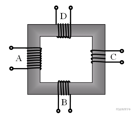 В трансформаторе, изображённом на рисунке, на вход А подают переменное напряжение. На обмотках B, C и D возникает ЭДС индукции. Количество витков равно изображённому на рисунке. Расположите обмотки B, C и D в порядке уменьшения ЭДС индукции. Запишите в ответе соответствующую последовательность цифр.