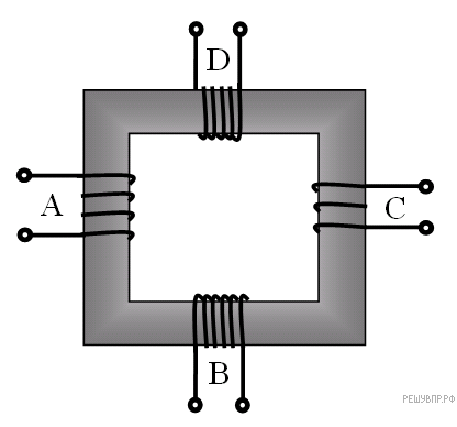 В трансформаторе, изображённом на рисунке, на вход А подают переменное напряжение. На обмотках B, C и D возникает ЭДС индукции. Количество витков равно изображённому на рисунке. Расположите обмотки B, C и D в порядке увеличения ЭДС индукции. Запишите в ответе соответствующую последовательность цифр.