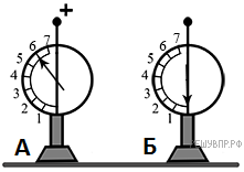На рисунке изображены два одинаковых электрометра. Шар электрометра А заряжен положительно и показывает 6 единиц заряда, шар электрометра Б не заряжен. Каковы будут показания электрометров, если их шары соединить тонкой серебряной проволокой?