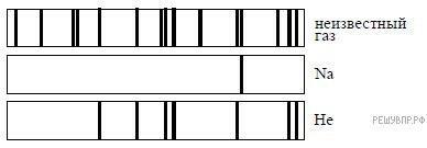 На рисунке приведены спектр поглощения разреженных атомарных паров неизвестного газа и спектры поглощения паров натрия и гелия.