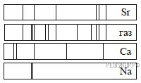 На рисунке приведён спектр поглощения неизвестного газа и спектры поглощения паров стронция, кальция и натрия.