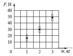 Космонавты исследовали зависимость силы тяжести от массы тела на посещённой ими планете. Погрешность измерения силы тяжести равна 5 Н, а массы тела – 50 г. Результаты измерений с учётом их погрешности представлены на графике.