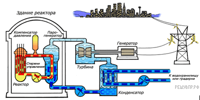 На рисунке показана схема работы атомной электростанции с двухконтурным водоводяным энергетическим реактором . Энергия, выделяемая в активной зоне реактора, передаётся теплоносителю первого контура. Далее теплоноситель поступает в теплообменник (парогенератор), где нагревает до кипения воду второго контура. Полученный при этом пар поступает в турбины , вращающие электрогенераторы . На выходе из турбин пар поступает в конденсатор , где охлаждается большим количеством воды, поступающим из водохранилища.