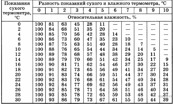 | Показания сухого термометра, °С | Разность показаний сухого и влажного термометра, °С | ||||||||||