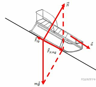 Санки равнозамедленно скатываются по наклонной плоскости в поле силы тяжести. Нарисуйте все силы, действующие на санки и направление их ускорения.
