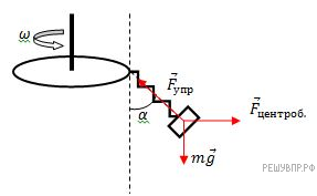 К диску, вращающемуся с постоянной угловой скоростью, прикреплена пружина, на конце которой висит груз массы m. Нарисуйте все силы, которые действуют на груз в системе отсчета, связанной с диском, если известно, что угол α при вращении диска не изменяется.