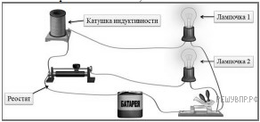 Какое явление привело к тому, что лампочка 1 загорелась позже, чем лампочка 2?