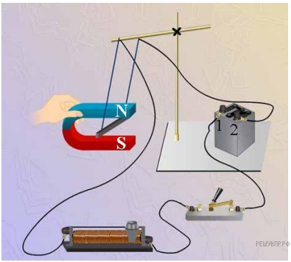 По прямому горизонтальному проводнику, висящему на длинных тонких проволоках, пропускают электрический ток от батарейки. К проводнику подносят постоянный подковообразный магнит с указанными магнитными полюсами. В результате проводник отклонился от вертикали так, как показано на рисунке. Укажите полярность клемм батарейки.