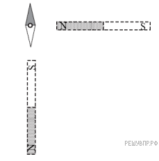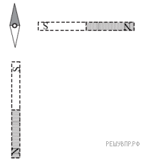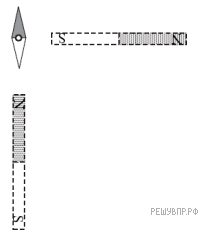 Магнитная стрелка компаса зафиксирована (северный полюс затемнен, см. рис.). К компасу поднесли сильный постоянный полосовой магнит, затем освободили стрелку, она повернулась и остановилась в новом положении. Изобразите, новое положение стрелки.