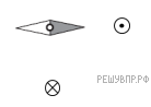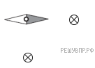 Магнитная стрелка компаса зафиксирована (северный полюс затемнен, см. рис.). К компасу поднесли на равном расстоянии два проводника с одинаковым постоянным электрическим током (проводники расположены перпендикулярно плоскости рисунка), затем освободили стрелку, она повернулась и остановилась в новом положении. Изобразите новое положение стрелки.